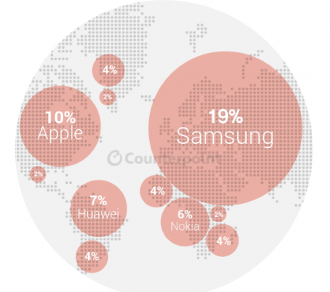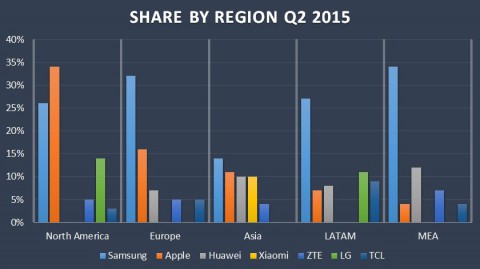 Samsung с 21% рынка по-прежнему остаётся лидером в 4 из 5 регионов мира: Азии (13%), Европе (31%), Латинской Америке (24%) и на Ближнем Востоке (25%). А вот в Северной Америке явным лидером остаётся Apple.