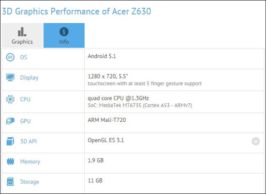 В базе данных бенчмарка GFXBench появилась информация о новом смартфоне Acer семейства Liquid, который фигурирует под обозначением Z630.