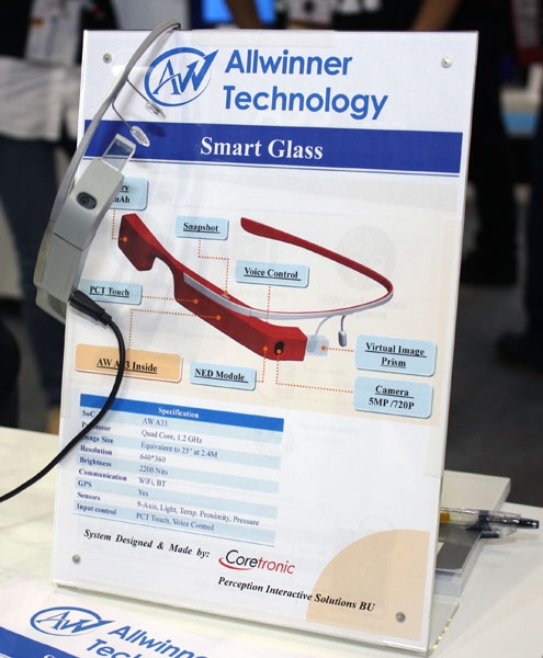 Смарт-очки Allwinner внешне очень похожи на Google Glass. По сути, они представляют собой оправу со специальным модулем в области правого глаза. В оснащение входят адаптеры беспроводной связи Wi-Fi и Bluetooth, приёмник спутниковой навигационной системы GPS, 5-мегапиксельная камера с поддержкой 720p-видеозаписи и традиционный для планшетов набор датчиков.