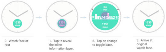 Упомянутые выше интерактивные циферблаты также станут очень серьезным нововведением в Android Wear. Они позволят пользователю менять данные на экране простым касанием его, например, переключать степень подробности или тип отображения информации о погоде.
