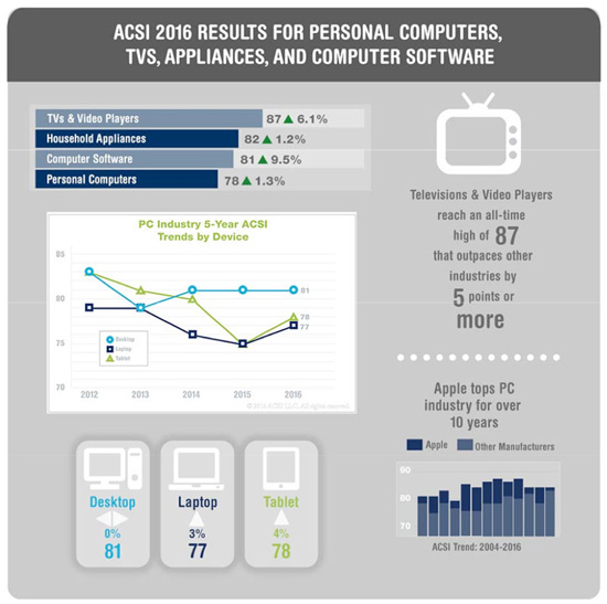 К удивлению, опрос показал возросший интерес пользователей к настольным персональным компьютерам, планшетам и ноутбукам. Степень удовлетворённости потребителей увеличилась по сравнению с прошлым годом на 1,3%, 4% и 3% соответственно.