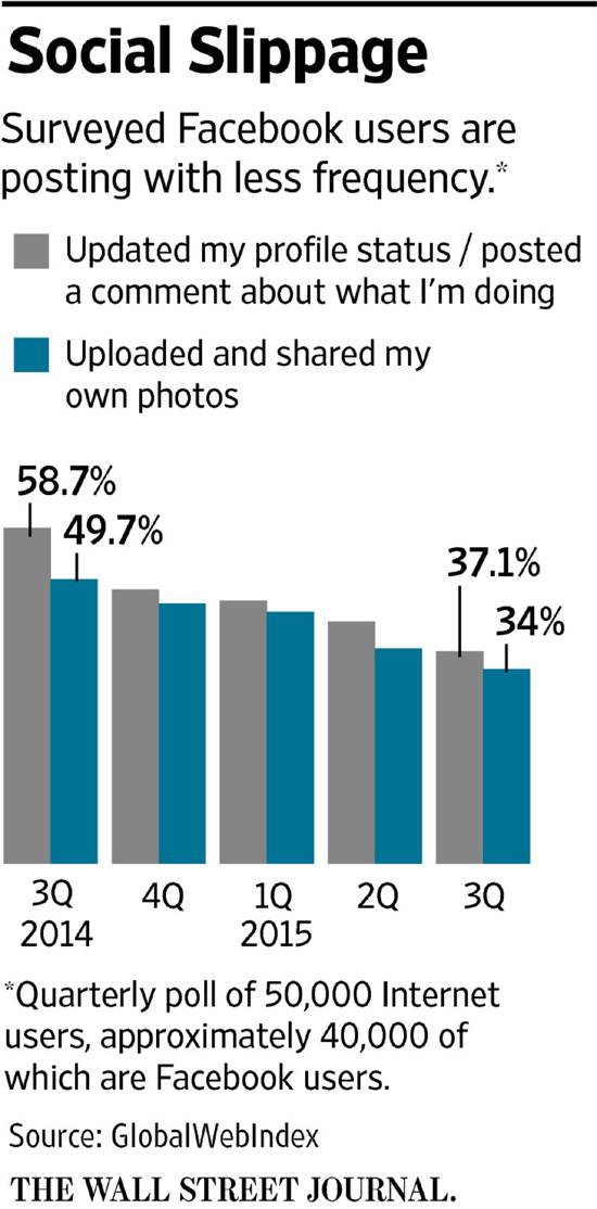Користувачі найбільшої у світі соцмережі Facebook стали рідше розміщувати власний контент, обмежуючись коментарями до чужих заміток. У третьому кварталі 2015 лише 34% користувачів соцмережі оновлювали статус і 37% ділилися власними фотографіями, порівняно з 50% і 59% відповідно в аналогічному кварталі минулого року.