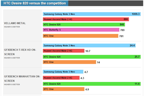 Ребята из Phone Arena заполучили предпродажную версию HTC Desire 820 и провели его испытания в трех популярных тестах. Первым из них стал пакет Vellamo, по параметру Metal выдавший гаджету 846 баллов. Таким образом, даже несмотря на 32-разрядную Android 4.4, не раскрывающую всю мощь смартфона, он обогнал One и Butterfly 2013 года. Правда, серьезно проиграл Samsung Galaxy Note 3 Neo с 1009,3 баллами.