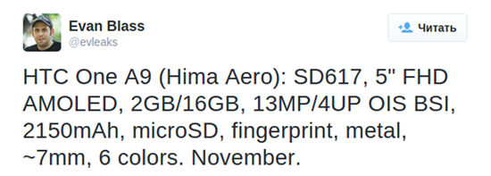 HTC One A9, также известный под псевдонимом Hima Aero, не будет флагманом, вновь написали заслуженный публикатор слухов Эван Бласс (Evan Blass, @evLeaks) и независимый разработчик @LlabTooFeR. Они раскрыли почти все основные характеристики новинки и некоторые ее особенности.