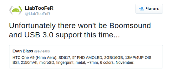 Сообщение @evLeaks переопубликовал у себя в ленте @LlabTooFeR, добавивший, что смартфон не получит поддержку USB 3.0 и даже не будет оснащен BoomSound, уже ставшими неотъемлемой частью мобильных устройств HTC среднего и высокого ценового сегмента.