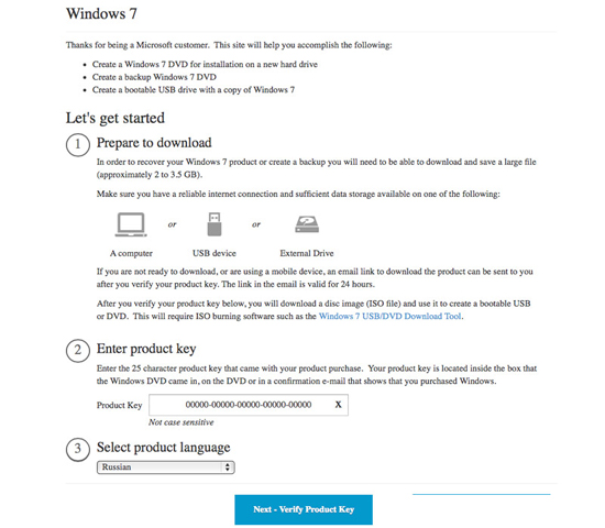 Получить ISO-образ Windows 7 можно на официальном сайте Microsoft. Страница доступна пока только на английском языке, но скачать можно и русскую сборку. Правда, для тех, кто хочет разжиться бесплатной операционкой, предложение не подойдет: чтобы скачать образ, необходимо указать 25-значный ключ, а полученная ссылка на образ действует в течение 24 часов. После проверки ключа начнется загрузка файла размером от 2 до 3,5 ГБ.