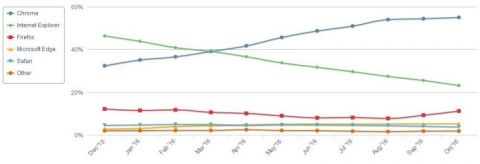 Chrome остаётся самым популярным браузером на компьютерах, имея на конец октября долю в 55%. Internet Explorer пока второй с результатом 23,13% против 25,63% месяцем ранее. Firefox также выигрывает от спада Internet Explorer, поднявшись за месяц с 9,19% до 11,14%.