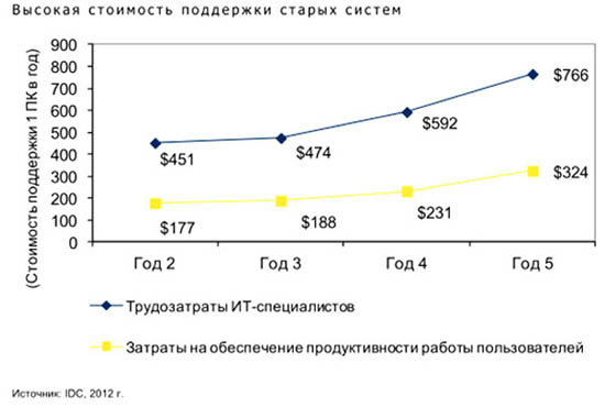 В свою очередь, IDC в мае 2012 года при поддержке софтверного гиганта подготовило отчет под красноречивым названием «Почему дальнейшее использование Windows XP — плохая идея». В отчете эксперты IDC Эл Джиллен, Рэнди Перри и Нэнси Селиг отмечают, что Windows XP уже на два поколения отстает от последних операционных систем Microsoft, а в ближайшем будущем будет отставать от них на целых три поколения, что однозначно негативно скажется на безопасности пользователей. «Например, среднегодовой расход на поддержку ПК с ОС Windows XP составляет $870, в то время как средние расходы на Windows 7 составляют $168 на ПК в год», — отмечают эксперты.