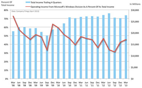 Динамика доходов Microsoft от продажи ОС семейства Windows на фоне общего дохода компании