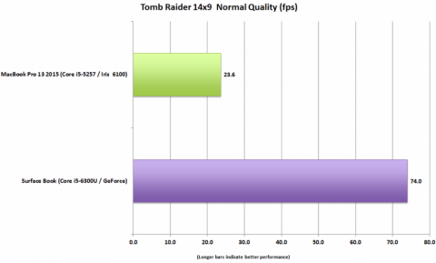 Единственный тест, где Microsoft Surface Book полностью "уделал" MacBook Pro 13 - это видеоигры. В игре Tomb Raider первый показал 74 кадров в секунду, тогда как на MacBook было только 23,6 fps. Но это заслуга дискретной видеокарты NVIDIA.
