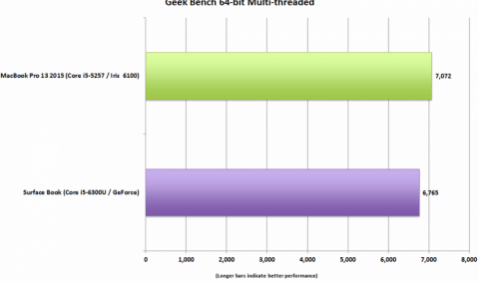 Согласно результатам бенчмарка Geekbench 3, MacBook Pro 13 2015 года за $1 500 с процессором Intel Core i5-5257 и графикой Iris 6100 немного обходит в производительности Microsoft Surface Book за $1 700 с процессором Intel Core i5-6300U и видеокартой NVIDIA.