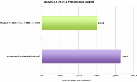 Обойти конкурента Microsoft Surface Book удалось в бенчмарке LuxMark, но превосходство было далеко не в два раза, как обещали на презентации.