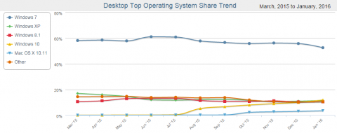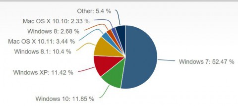 Наиболее распространённой ОС остаётся Windows 7, доля которой снизилась с более чем 60% в июне 2015 года до 52,47% в январе 2016 года.