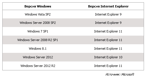 Поддерживаемые версии Internet Explorer в зависимости от версии Windows (с 12 января 2016 г.)