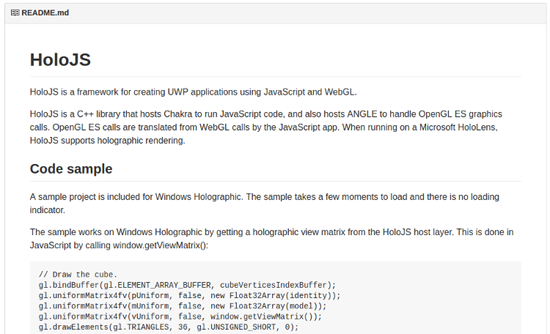 HoloJS представляет собой C++ библиотеку, которая использует ядро Chakra для выполнения JavaScript-кода, а также включает графический движок ANGLE для работы с графикой OpenGL ES. Таким образом, разработчики, имеющие опыт работы с JavaScript и WebGL, могут без существенных усилий начать использовать свои знания для разработки приложений под HoloLens. Код HoloJS появился на GitHub несколько дней назад, но Microsoft не публиковала никаких громких анонсов.