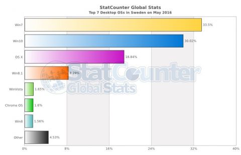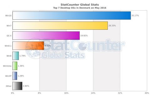 В Дании Windows 10 уже лидирует на персональных компьютерах, статистика от StatCounter показывает её долю в 35,17%, тогда как у Windows 7 она равна 28,33%, а у OS X лишь 19,92%. В Швеции Windows 10 почти догнала Windows 7, при сохранении имеющихся темпов роста уже в июне они поменяются местами. Пока же у Windows 7 результат был равен 33,5%, у Windows 10 30,02%.