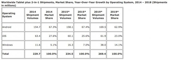 IDC пересмотрела свой прогноз в соответствии с крайне низким показателем продаж планшетов в 2015 году. Ожидается, что будет продано около 234,5 миллионов устройств, что всего на 2,1% больше, чем в 2014. В своем долгоиграющем прогнозе на 2019 год компания ожидает значительный рост продаж планшетов на платформе Windows - c 7 до 14%. Самое большое падение предрекают Android, доля рынка которого может сократиться на 4,5%.
