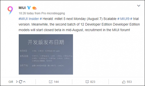 В Китае MIUI 9 для разработчиков станет доступна 11 августа для смартфонов Mi 6, Mi 5X и Redmi Note 4X, 25 августа — для Mi MIX, Mi Note 2, Mi 5, Mi 5s, Mi 5s Plus, Mi 5c, Mi Max 2, Mi Max 32G, Mi Max 64G/128G, Mi 4S, Mi 4c, Mi Note Pro и Redmi 4X. В конце сентября планируется выпустить стабильную версию прошивки для остальных устройств Xiaomi и Redmi.