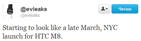 Известный по утечкам Twitter-аккаунт @evleaks сообщил, что нью-йоркский запуск HTC M8 запланирован на конец марта, то есть через месяц после предполагаемой даты анонса. Срок кажется приемлемым для регионального запуска на рынке, где большую силу имеют операторы. Стоит помнить, что каждый из американских провайдеров связи требует свою версию флагмана, чаще всего не только с фирменным ПО, но и брендированием корпуса устройства. В принципе, срок в месяц с даты анонса почти совпадает с таковыми у One, HTC лишь на немного задержали предыдущий топовый смартфон из-за проблем с производством модулей камеры.