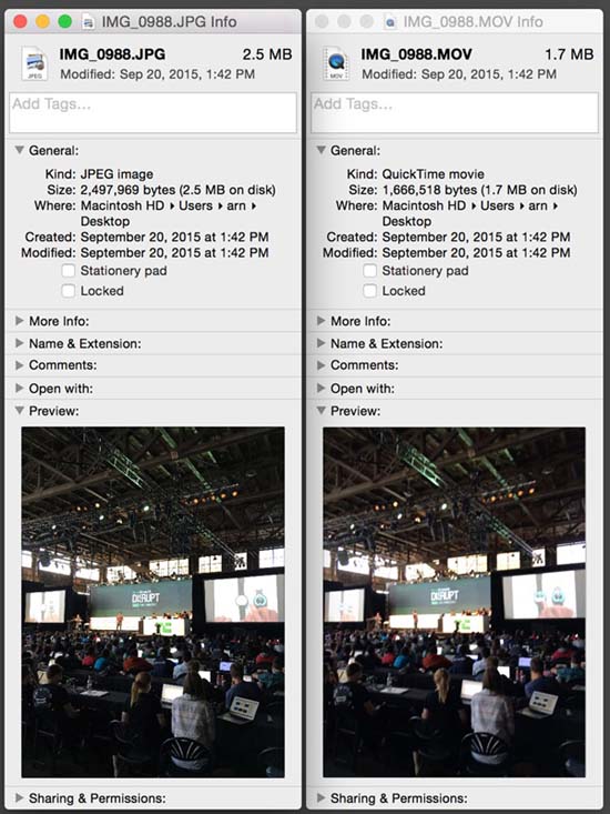 В тестовом фотоснимке, сделанном на основную камеру iPhone 6s, компоненты JPG и MOV занимают около 2,5 и 1,7 МБ соответственно. Фронтальная камера с более низким разрешением генерирует файлы размером 1 МБ и 1,7 МБ соответственно. Разрешение MOV-видео – 960×720 пикселей, 12 кадров в секунду в обоих случаях.