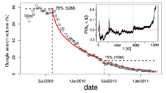 Социальная сеть в интернете — довольно зыбкая структура. Даже самый популярный сайт очень быстро может уйти в небытие, как только из него начнётся исход пользователей. Когда этот процесс начинается, социальная сеть распадается на части и перестаёт функционировать. В истории интернета было несколько примеров, когда очень популярные социальные сети резко теряли свою популярность, потому что аудитория уходила на другие сайты. Похоже, что это вполне естественный процесс, и такая же судьба может ожидать популярные нынче Facebook, «Вконтакте», когда у них прекратится фаза роста.