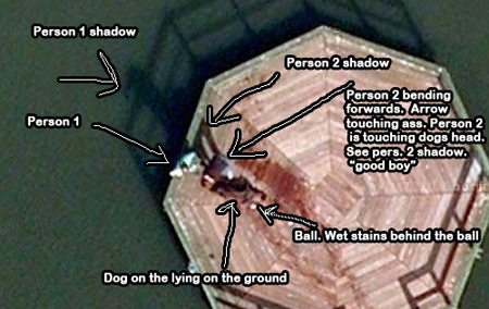 Что интересно, тут же рядом можно увидеть фигуры двух велосипедистов с собакой. И вот теперь все задаются вопросом: это одни и те же люди, сфотографированные спутником с задержкой в пару минут, или все-таки разные? Отличная основа для ремейка «Blow Up» Антониони.