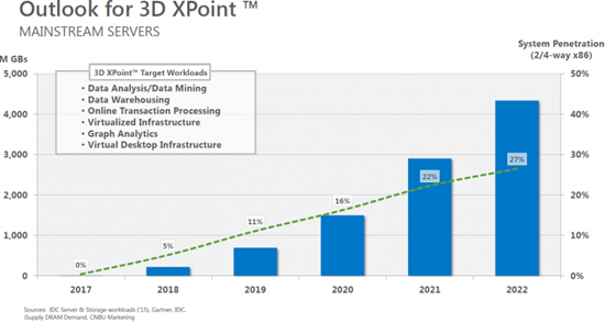 Так, в 2018 году лишь 5 % типовых серверов (с двумя или четырьмя процессорными гнёздами) будут использовать память 3D XPoint в каком-либо форм-факторе (NVDIMM, PCIe карта, 2,5-дюймовый SSD с U.2/SFF-8639 коннектором). К 2020 году уже 16 % серверов будут оснащены 3D XPoint. Однако уже в 2022 году более четверти серверов — около 27 % — будут использовать память накопителей 3D XPoint, если предсказания Micron окажутся точными. Как видно, 3D XPoint не заменит собой обычную твердотельную NAND флеш-память, но накопители на её основе займут своё место в центрах обработки данных.