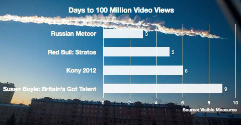 Ролики, запечатлевшие падение метеорита в Челябинской области, поставили рекорд по скорости роста популярности. Все размещенные видео менее чем за 72 часа собрали больше 100 млн просмотров, опередив Феликса Баумгартнера с его прыжком из стратосферы, участницу шоу Britain's Got Talent Сьюзан Бойл и даже рэпера PSY с его популярной композицией Gangnam Style.