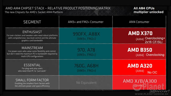 В поисках сведений о процессорах и материнских платах Socket AM4 энтузиасты действуют сразу по нескольким фронтам. В частности, немецкому ресурсу Planet 3DNow! удалось выяснить, что флагманский чипсет AMD X370 будет использоваться в основном не на платах с APU Bristol Ridge, а в связке с топовыми моделями Summit Ridge. Микросхема X370 будет отвечать за работу графических конфигураций AMD CrossFire и NVIDIA SLI по формуле «x16 + x16» и, кроме того, предоставит любителям и мастерам разгона расширенные возможности по осуществлению оного.