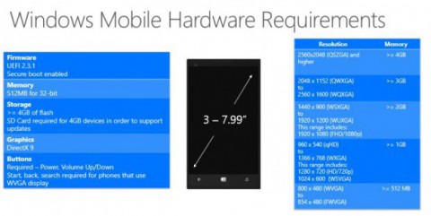 Требования включают минимальный объем памяти в 512 МБ и минимально допустимое пространство для хранения данных в 4 ГБ. Интересной особенностью является выдвинутые Microsoft условия к объёму оперативной памяти относительно разрешения дисплея. Так, устройства с Full HD-разрешением должны экипироваться 2 ГБ памяти, а смартфонам с QHD-экраном потребуется 3 ГБ оперативной памяти.
