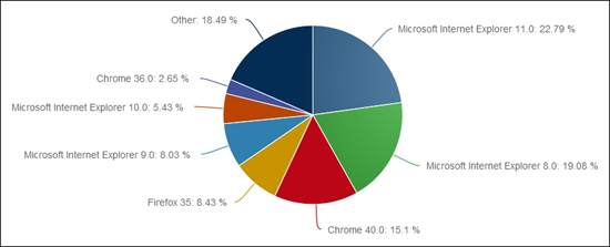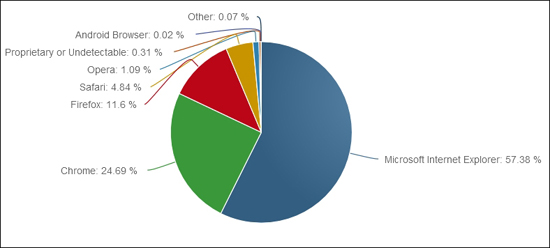 На первом месте по распространённости традиционно находится Microsoft Internet Explorer с результатом в 57,4 % по итогам прошлого месяца. Годом ранее на этот обозреватель приходилось 58,2 % мирового рынка. Самыми распространёнными версиями браузера являются Internet Explorer 11.0 и Internet Explorer 8.0 с показателем соответственно 22,8 и 19,1 %.