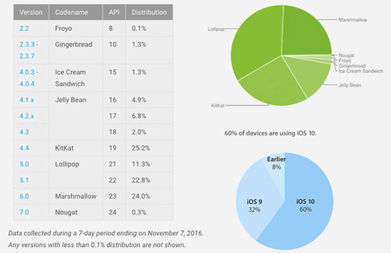 Доля iOS 10 превосходит Android Nougat в 200 раз