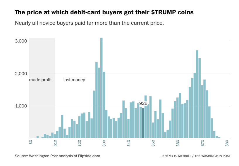 Видання The Post проаналізувало, як змінилися активи $TRUMP у покупців мем-коінів-початківців з моменту запуску цієї монети в січні 2025 року до 7 травня, на відміну від тих, чия взаємодія з монетою свідчила про кращу обізнаність з криптовалютою. Аналіз The Post зосередився на гаманцях, які купили $TRUMP лише один раз, використовуючи рекомендований постачальником метод: платіжний процесор MoonPay та додаток для мем-коінів Moonshot. Таким чином, аналіз The Post виключив усіх, хто купив $TRUMP за іншу криптовалюту або за кошти з таких джерел, як Coinbase або Robinhood. Він також виключив гаманці, які продавали свої $TRUMP більше одного разу. 67 000 покупців-початківців $TRUMP витратили загалом близько 15 мільйонів доларів.