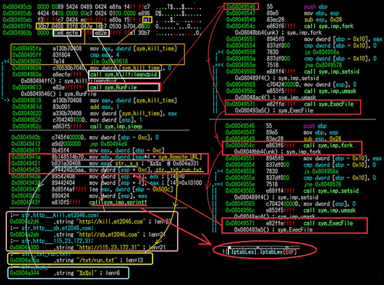 Фрагмент кода XOR.DDoS, загружающий дополнительные вредоносные компоненты (изображение: malwaremustdie.org).