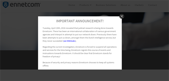 На сайте Ennetcom тоже опубликовано официальное сообщение о происходящем. Компания ссылается на WikiLeaks, по данным которого, правоохранительные органы пытались прекратить работу Ennetcom неоднократно, но на этот раз к делу подключился даже Интерпол. Компания пишет, что отключила все сервисы из соображений безопасности и ради сохранности приватных данных пользователей.