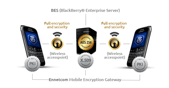 Ennetcom (Encrypted Network Communications) предоставляла своим клиентам услуги мобильной сети, весь трафик которой проходил через платформу BlackBerry Enterprise Servers (BES) с использованием PGP-шифрования и системы, которую компания называла Mobile Encryption Gateway. Для этих целей клиенты приобретали у компании смартфоны Blackberry, переделанные специальным образом для доступа к сети Ennetcom. Стоимость таких смартфонов составляла 1500 евро. Компания заверяла, что «невозможно перехватить и расшифровать какие-либо данные, отправленные с одного устройство на другое».