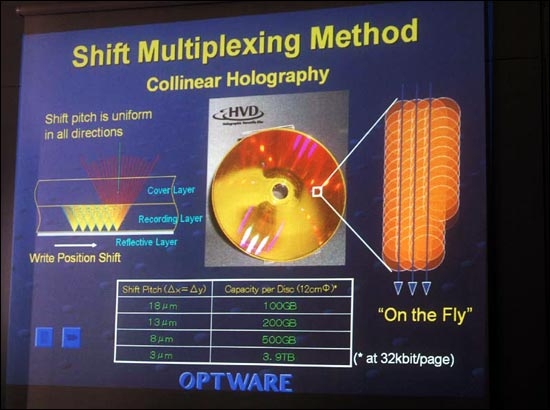 Как следует из краткого описания технологии голографической записи, которую разрабатывает Токийский Университет (Tokyo University of Science), разработчики используют подход, во многом похожий или даже продолжающий разработки компании OPTWARE (хотя отсылок к этому нет). Для записи используется опорный луч или луч синхронизации «сферической» формы и информационный луч. Информационный луч, который записывает или считывает данные, меняет наклон по отношению к опорному лучу, что ведёт к изменению картинки в месте пересечения лучей, а это объёмная область пространства внутри носителя. Тем самым происходит запись и считывание пространственной картины, занимающей весь объём внутри рабочего слоя оптического носителя.