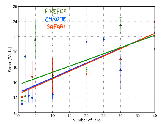 Gizmodo опубликовал странное, но довольно полезное исследование. Неизвестно, кто его провел, но видимо кто-то у кого море свободного времени. Итак, смысл в том, что было измерено количество энергии, которую MacBook Pro тратит на поддержание каждой открытой вкладки в браузере. Получилось 0.19 Ватт на каждую вкладку в Safari или Chrome. По нехитрым подсчетам получается, что если вы откроете 100 вкладок, то сократите время работы от заряда батареи MacBook Pro на 1 час.