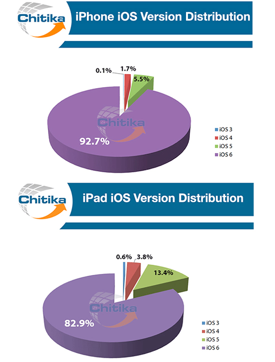 Рекламная сеть Chitika провела исследование, согласно результатам которого операционная система iOS 6 установлена на 92,7% смартфонах iPhone и 82,9% планшетах iPad. Данные были получены в ходе анализа более 300 миллионов веб-страниц в США и Канаде по состоянию на конец мая.