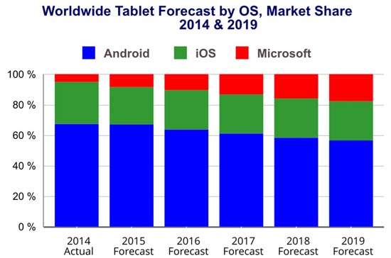 В IDC считают, что Apple ожидает небольшой рост, за которым последует период стагнации. По прогнозу аналитиков, в следующем году доля iPad на рынке планшетов увеличится с нынешних 24,5% до 25,8%. Windows ожидает резкий рост до 17,8% с нынешних 8,5% к 2019-му. Доля Android опустится ниже 60% в 2018 году по сравнению с нынешним показателем почти 70%.