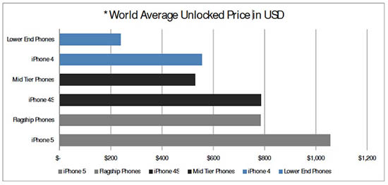 Рассмотрев цены на шести международных рынках — Германии, Великобритании, Франции, Китая, Бразилии и Индии — Манстер отметил, что на данный момент самый дешевый смартфон Apple (iPhone 4) на 133% дороже среднестатистического смартфона на рынке устройств начального уровня. Тогда как iPhone 5 на 19% дороже, чем флагманы конкурентов, а «среднеуровневый» iPhone 4S дороже конкурентов на 48%. Это значит, что на рынке дешевых устройств компании крыть нечем. Однако рынок этот чрезвычайно важен, считает эксперт.