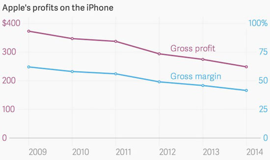 «Большой означает больше» – это выражение справедливо и при оценке затрат самой Apple, связанных с данным сегментом бизнеса. Точнее, снижается ее прибыль в пересчете на единицу проданного устройства, что вынуждает бренд создавать и реализовывать все больше и больше гаджетов. И так из года в год – доказательство на графике.