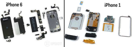 Но есть одна загвоздка. Инновации Apple — это не только программное обеспечение, но и инжиниринг. Сравните iPhone 2G (2007) и iPhone 6 (2014):