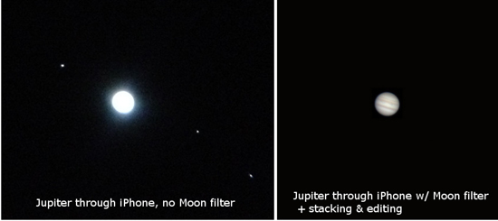 Оптические фильтры. Камера iPhone имеет прекрасное разрешение, но даже с нынешним контролем экспозиции она вряд ли сможет отобразить тонкие планетарные черты. Чтобы захватить все детали, вам нужно будет использовать оптические фильтры (например, Moon filter) и/или цветные фильтры, которые позволят уменьшить яркость объекта. Здорово, если в вашем распоряжении окажется несколько фильтров. С одними вы сможете снимать полную луну, с другими — луну в сумерках. При фотографировании Юпитера, оптический фильтр позволит вам отобразить все его детали. Без него планета будет выглядеть яркой, даже пересвеченной. С помощью Moon filter вы сможете убрать эту яркость и добавить приятных глазу подробностей. А вот при съемке Сатурна можно использовать синий фильтр. Он придаст планете неестественный голубоватый оттенок, зато подчеркнет кольца, находящиеся вокруг планеты, которые не будут видны при использовании Moon filter.