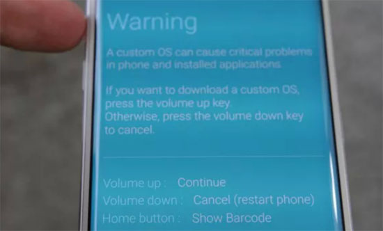 10. Выключите смартфон и снова включите его, зажав одновременно три кнопки: питания, убавления громкости и домашней страницы. Должен появиться синий экран с предупреждением об опасности установки кастомной прошивки.