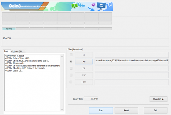 13. Запустите программу Odin, нажмите кнопку AP и найдите в папке с прошивкой файл с расширением .tar.md5.