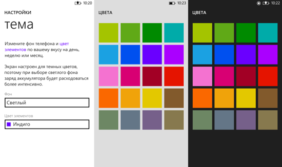На Windows Phone пока нет обоев, а значки всех системных приложений и большинства сторонних меняют цвет оформления в зависимости от выбранной цветовой схемы. Тем в операционной системе мало: только черный или белый фон и двадцать акцентных цветов.