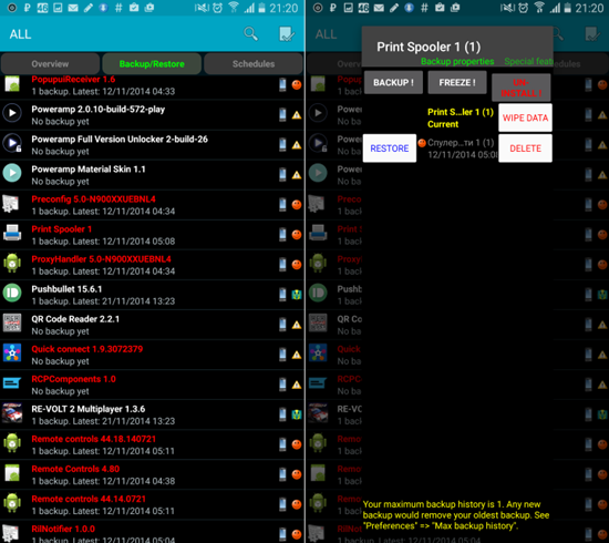 7. Удаленные приложения в списке Titanium Backup будут зачеркнуты, но при желании вы сможете их восстановить — для этого нужно нажать кнопку «RESTORE».