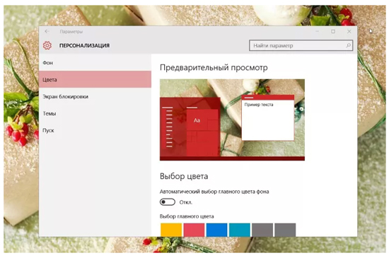 В Windows 10 вы также можете указать, каким должен быть цвет панели задач и панелей заголовков окон. Он может автоматически меняться вместе с обоями либо вы можете выбрать определенный цвет. Чтобы выбрать автоматическую смену цветов, откройте «Параметры» (Win+I), перейдите в раздел «Персонализация» и в пункте «Цвета» активируйте тумблер у опции «Автоматический выбор главного цвета фона». Во втором случае нужно деактивировать этот тумблер и в появившейся палитре выбрать любой подходящий цвет.