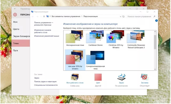 После Нового года уместно будет вернуть компьютеру прежнее, непраздничное оформление. Для этого нужно открыть «Параметры», зайти в раздел «Персонализация» и в пункте «Темы» нажать «Параметры темы». Откроются настройки тем в панели задач, где можно выбрать любое из установленных у вас оформлений операционной системы.